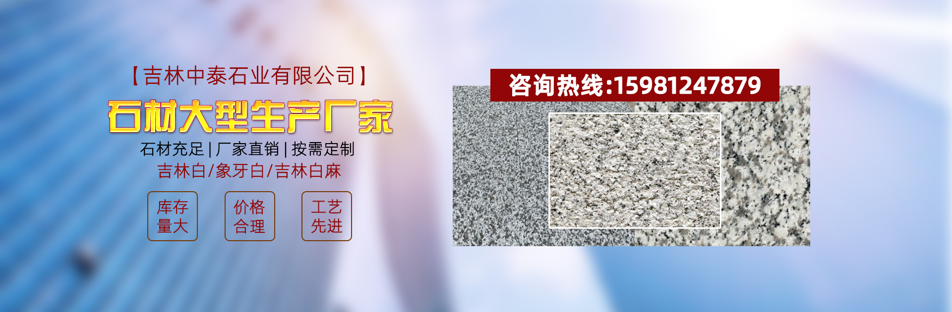 吉林中泰石業有限公司位于吉林省蛟河市天崗鎮。自創立之初,即定位于新型綠色環保石材生產企業。憑借當地的石材自然資源優勢,積極響應建設東北石都的號召,大力發展石材生產加工能力。